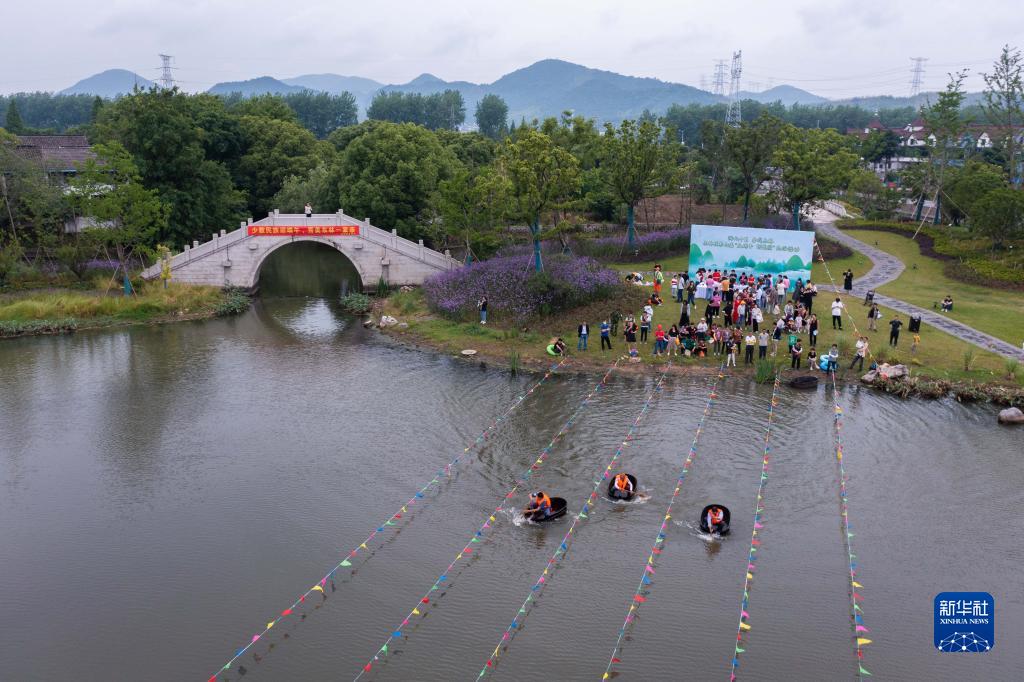 5月28日,在東林鎮(zhèn)保國(guó)村倪家灣港,村民參加“慶端午 劃菱桶”趣味比賽。新華社記者 徐昱 攝