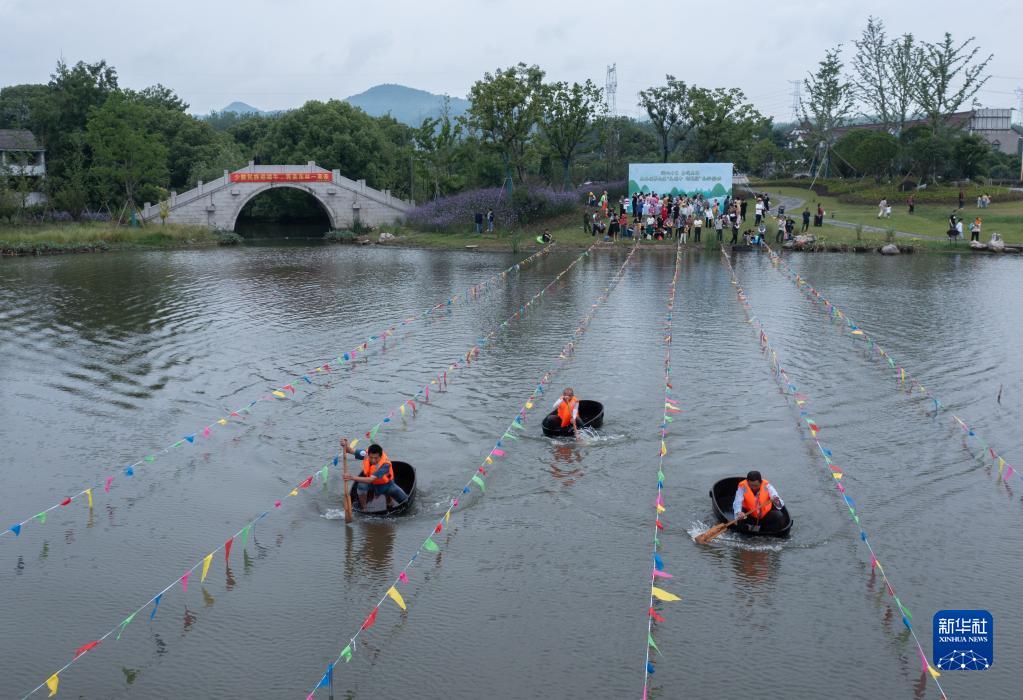 5月28日,在東林鎮(zhèn)保國(guó)村倪家灣港,村民們參加“慶端午 劃菱桶”趣味比賽。新華社記者 徐昱 攝
