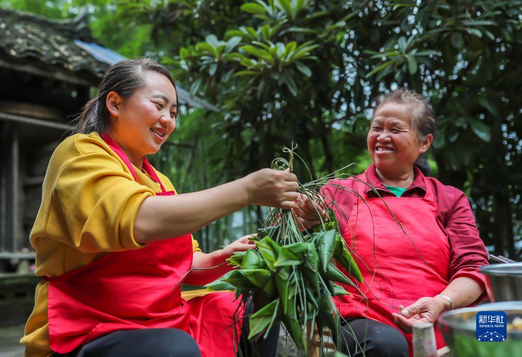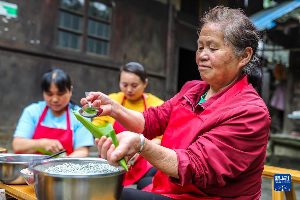 5月25日,村民在貴州省岑鞏縣思旸鎮(zhèn)龍江村包粽子。新華社發(fā)(胡攀學 攝)