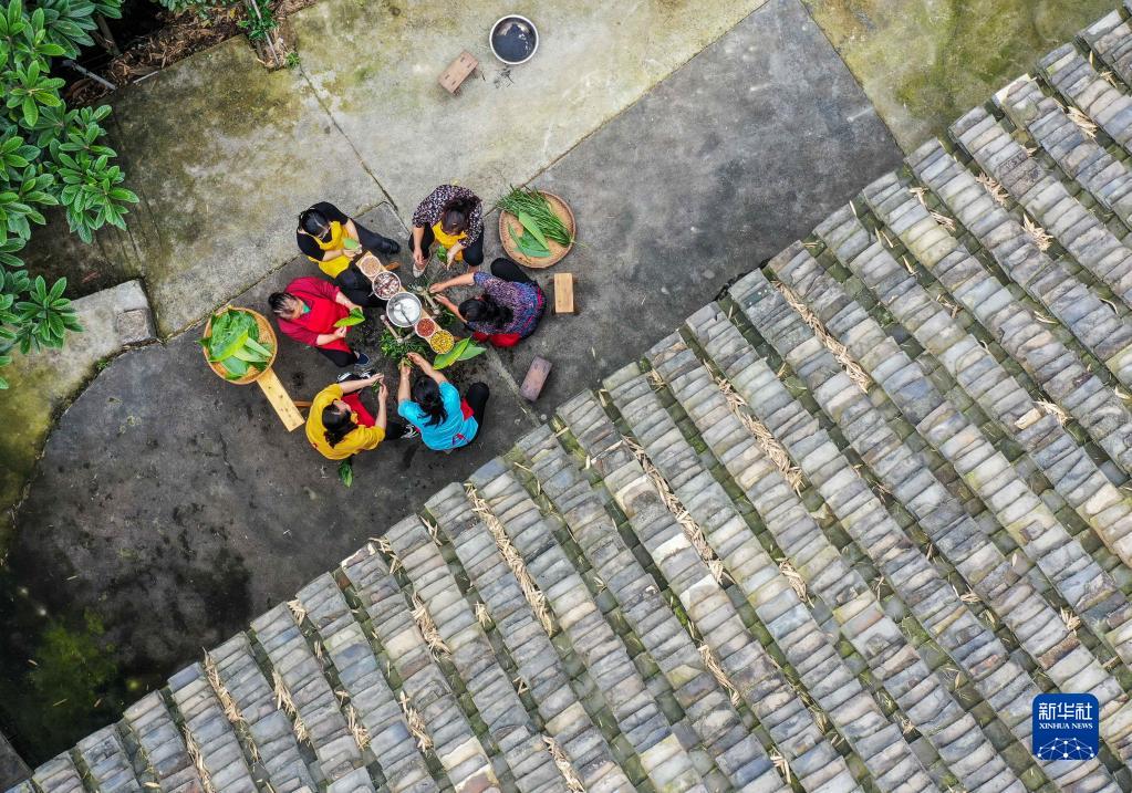 5月25日,村民在貴州省岑鞏縣思旸鎮(zhèn)龍江村包粽子(無人機照片)。新華社發(fā)(胡攀學 攝)