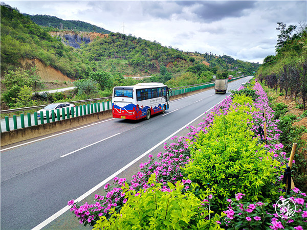 仲夏時節(jié),昆磨高速普洱至景洪段的羊蹄甲、紫薇、火把花等植物百花齊放,大風埡口隧道口姹紫嫣紅的三角梅,寧洱收費站立交粉嫩養(yǎng)眼的金絲桃,高速中央隔離帶嬌艷欲滴的木槿,在幾場雨水的洗禮和管理處的精心養(yǎng)護下,變得生機盎然。昆磨高速普洱管理處轄區(qū)管養(yǎng)路段植被豐富,公路蜿蜒穿梭在青山綠水間,共設(shè)有5個立交苗圃基地示范區(qū),以開花喬木為主,地被為輔,四季開花,豐富了植物層次,一立交一風景,樹綠花紅的景象與高速公路融為一體交相輝映。