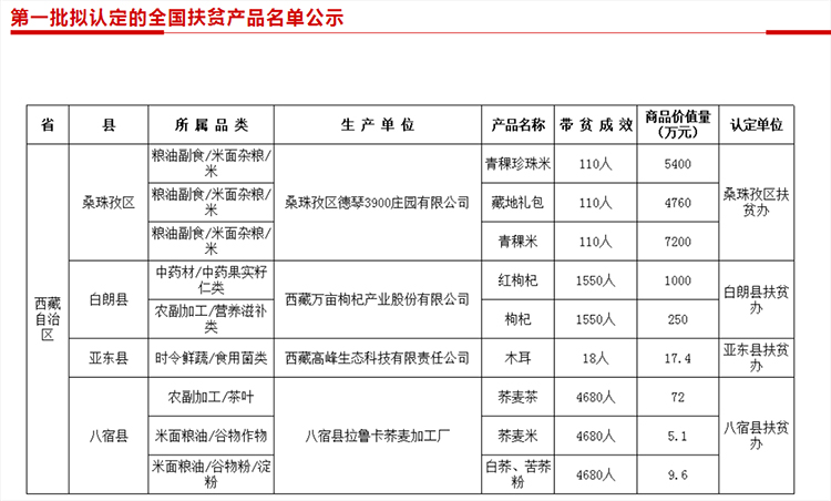 圖為第一批《全國扶貧產(chǎn)品名單》中的西藏自治區(qū)部分來源:中國社會扶貧網(wǎng)