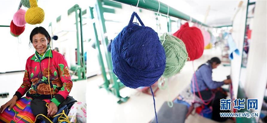 拼版照片:左圖為西藏阿里地區(qū)改則縣物瑪鄉(xiāng)村民央卓在噶爾縣康樂(lè)新居服裝地毯加工廠;右圖為央卓在噶爾縣康樂(lè)新居服裝地毯加工廠工作。2017年,央卓和家人從改則縣物瑪鄉(xiāng)搬遷到噶爾縣康樂(lè)新居易地扶貧搬遷安置點(diǎn),住進(jìn)了125平方米的新居。2018年7月,央卓和女兒參加了康樂(lè)新居服裝地毯加工廠的培訓(xùn),在家門口找到了工作(7月25日攝)。 新華社記者 詹彥 攝