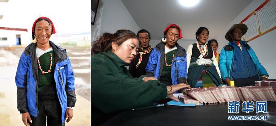 拼版照片:左圖為西藏日喀則市定日縣克瑪鄉(xiāng)幫布村村民阿羅;右圖為阿羅在幫布村牦牛養(yǎng)殖農(nóng)民專業(yè)合作社領(lǐng)工資。2019年,阿羅把家里的100多只羊入股了合作社享受分紅,自己也加入了合作社負(fù)責(zé)放羊,每個(gè)月有3000元的收入(7月31日攝)。 新華社記者 詹彥 攝