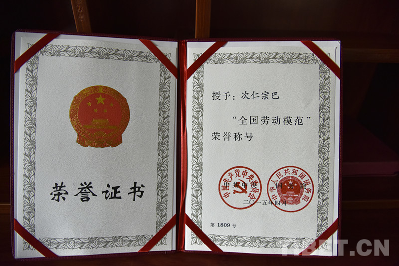 圖為次仁宗巴2015年獲得的“全國勞動模范”榮譽稱號證書 攝影:王媛媛