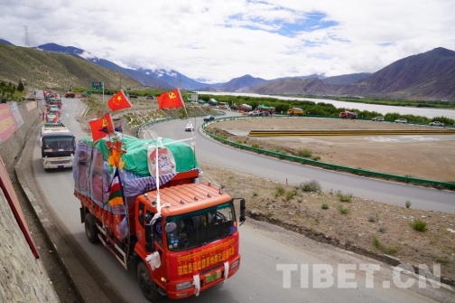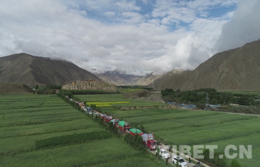 7月10日9時(shí)30分,國家重點(diǎn)文物保護(hù)單位——松贊干布陵區(qū)前,懸掛著“瓊結(jié)鎮(zhèn)易地搬遷運(yùn)輸車隊(duì)”的39輛車整齊列隊(duì), 20戶78名搬遷戶身著節(jié)日的盛裝,坐著滿載著搬遷群眾幸福和希望的運(yùn)輸車隊(duì)浩浩蕩蕩地從瓊結(jié)縣出發(fā),前往山南市乃東區(qū)多頗章鄉(xiāng)嘎東團(tuán)結(jié)新村搬遷點(diǎn)。