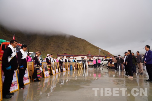 經(jīng)過一個(gè)多小時(shí)的路程,上午11時(shí)30分,車隊(duì)駛?cè)攵囝H章鄉(xiāng)嘎東團(tuán)結(jié)新村搬遷點(diǎn)喜遷儀式現(xiàn)場。在喜遷儀式現(xiàn)場,早早就到來的瓊結(jié)鎮(zhèn)扶貧干部們,端著甘甜的青稞酒和象征五谷豐登的切瑪盒,向每位搬遷戶群眾獻(xiàn)上潔白的哈達(dá)。搬遷戶們新的生活將從這里開始。