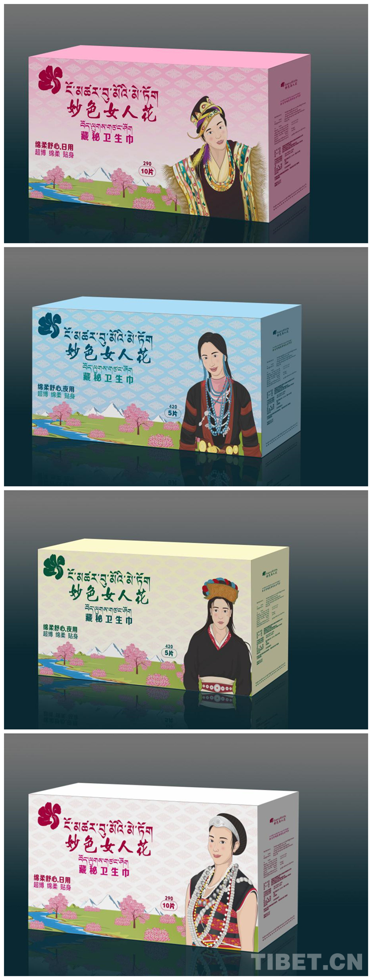 產(chǎn)品的包裝設(shè)計(jì)歷經(jīng)4個(gè)版本,拉巴次仁最終選定了身著傳統(tǒng)服飾的工布藏族、珞巴族、門(mén)巴族、僜人女性漫畫(huà)形象,他認(rèn)為這樣最能代表林芝女性的風(fēng)采。