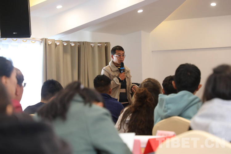 圖為拉巴次仁在林芝市人社局主辦的大學(xué)生“職來(lái)職往”現(xiàn)場(chǎng)招聘會(huì)上,作為創(chuàng)業(yè)代表分享創(chuàng)業(yè)經(jīng)驗(yàn)