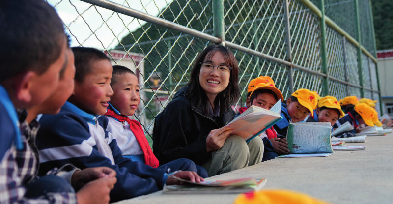 在西藏林芝市工布江達(dá)縣娘蒲鄉(xiāng)中心小學(xué),嶺南師范學(xué)院支教隊隊員涂建枝在晚自習(xí)前和孩子們一起溫習(xí)功課(2024年9月3日攝)劉洲鵬攝/本刊