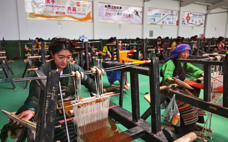 在西藏日喀則市仁布縣特色產(chǎn)業(yè)孵化園,亞德細(xì)褐羊毛織品農(nóng)民專業(yè)合作社工作人員在車間里織布(2024年9月1日攝)孫瑞博攝/本刊