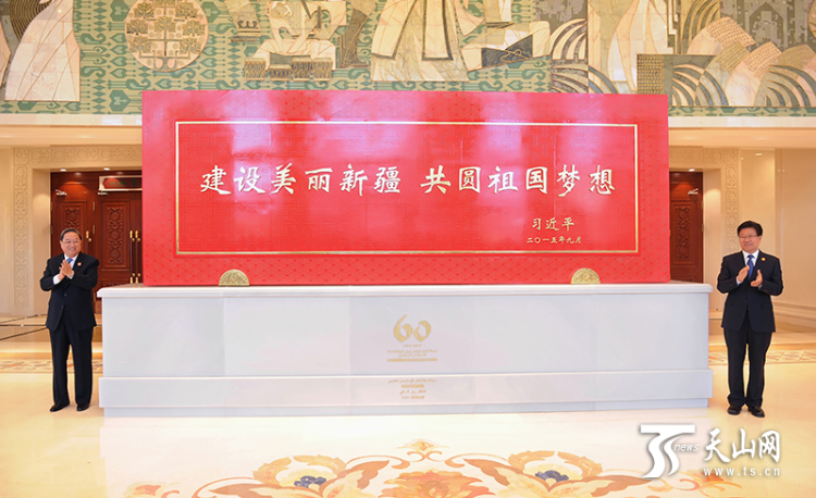 2015年9月25日,時(shí)任中共中央政治局常委、全國(guó)政協(xié)主席、中央代表團(tuán)團(tuán)長(zhǎng)俞正聲和時(shí)任中共中央政治局委員、自治區(qū)黨委書(shū)記張春賢一同為習(xí)近平總書(shū)記題詞賀匾揭幕。攝影:新疆日?qǐng)?bào)記者盧民一