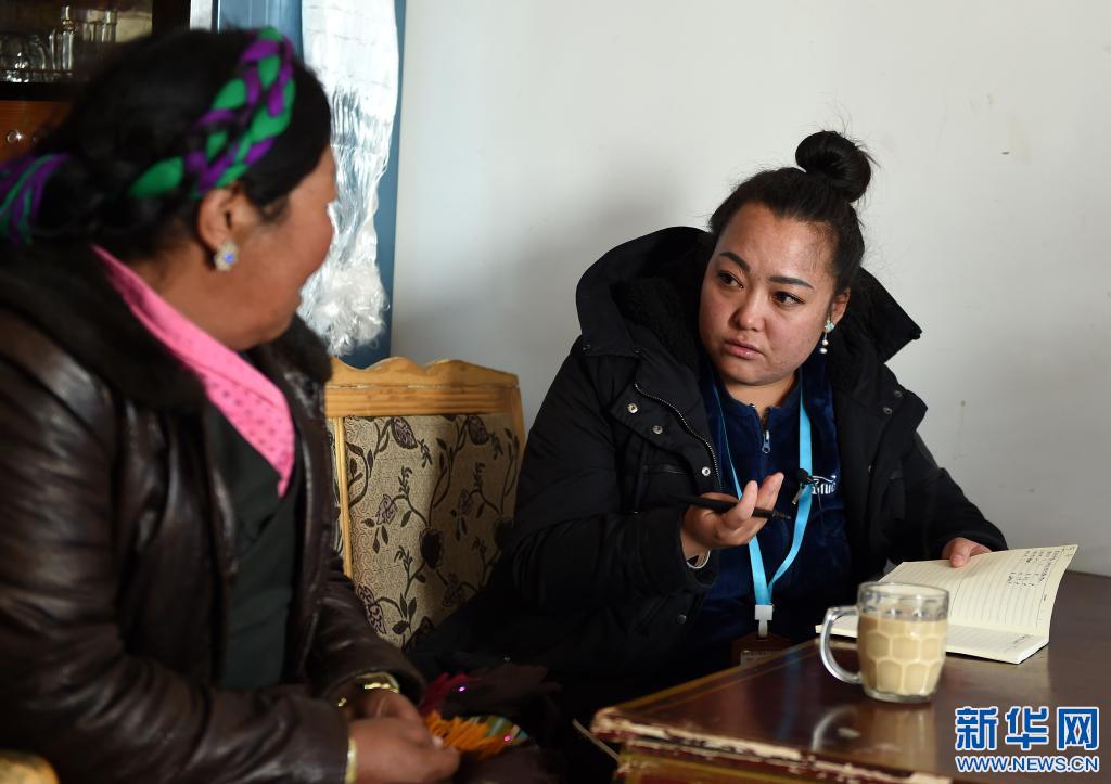 2018年3月6日,拉薩市曲水縣委宣傳部副部長(zhǎng)、才納鄉(xiāng)四季吉祥村黨支部第一書記索朗央吉(右)與村民商量編制規(guī)劃。新華社記者 覺果 攝