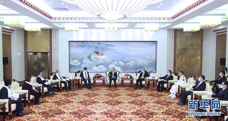 8月18日,以中共中央政治局常委、全國政協(xié)主席汪洋為團(tuán)長的中央代表團(tuán)飛抵拉薩,出席西藏和平解放70周年慶?;顒印J茳h中央和習(xí)近平總書記委托,汪洋在拉薩飯店看望在藏領(lǐng)導(dǎo)干部、老同志白瑪赤林、帕巴拉·格列朗杰和列確、巴桑,以及阿沛·阿旺晉美同志家人代表,向他們表示親切問候。新華社記者 劉彬 攝
