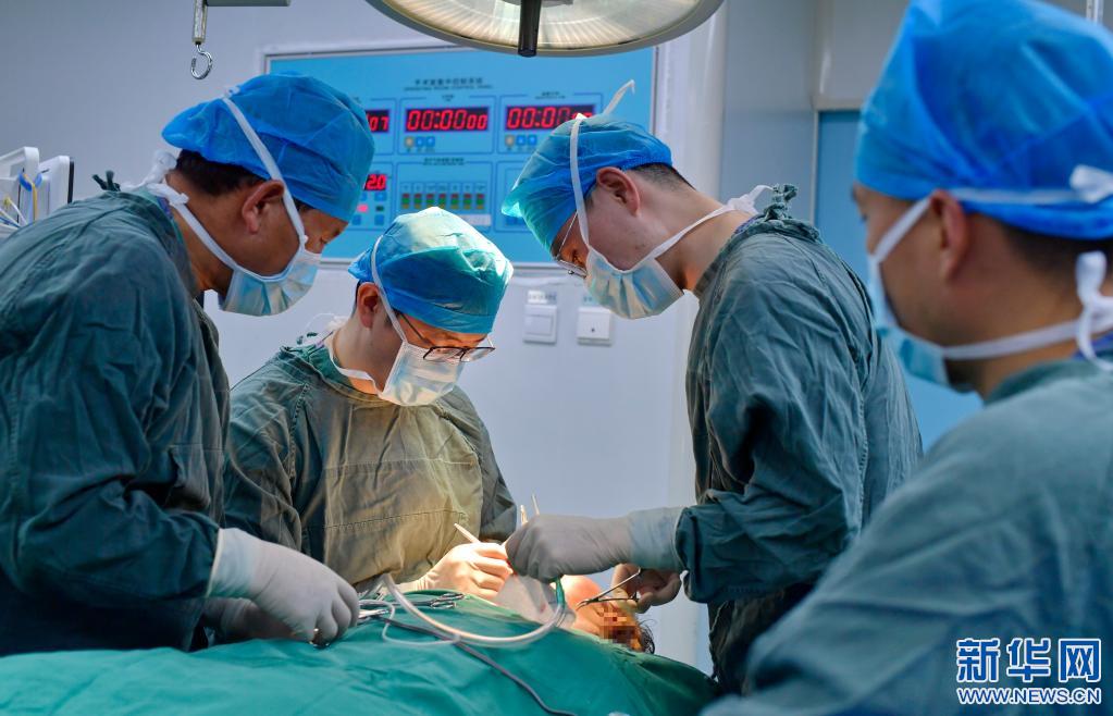 在西藏自治區(qū)人民醫(yī)院手術(shù)室,王克明(左二)和同事為面部畸形患者做手術(shù)(5月11日攝)。新華社記者 張汝鋒 攝