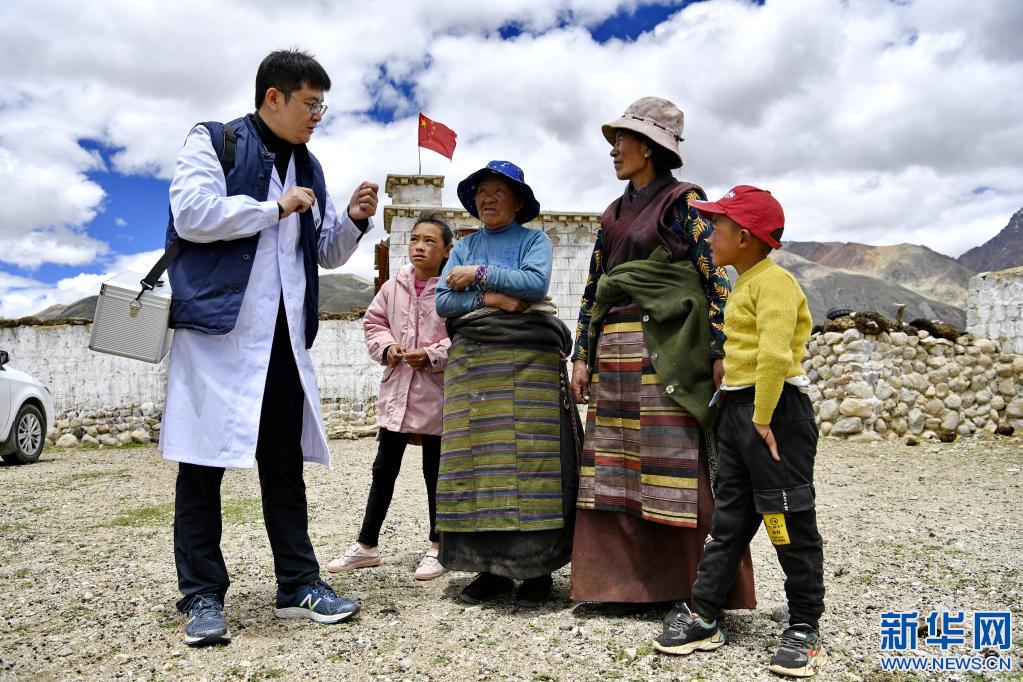 在拉薩市當(dāng)雄縣格達(dá)鄉(xiāng)格達(dá)村,前來(lái)義診的王克明(左一)為村民講解健康知識(shí)(6月19日攝)。新華社記者 張汝鋒 攝