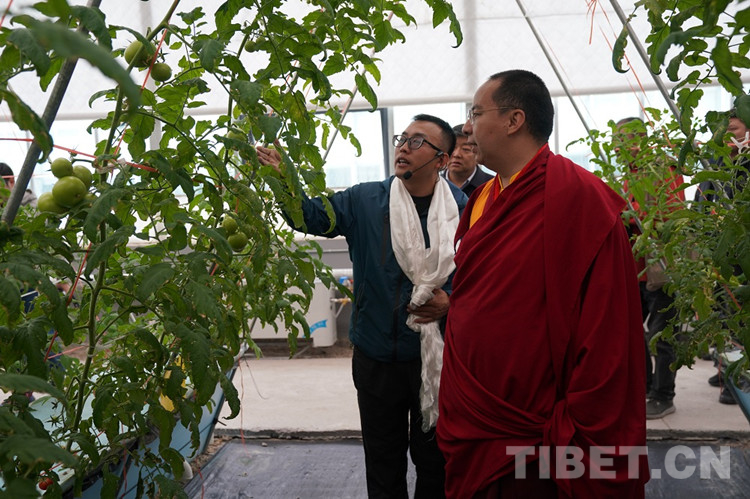 班禪走入蔬菜園、花卉園、熱帶植物園等溫室園區(qū),不時俯身仔細查看農(nóng)作物長勢。得知溫室內(nèi)竟種有百香果,班禪高興地說道:“百香果可是熱帶植物,能在那曲海拔這么高的地方種出來,很不容易!”在蔬菜園,班禪打開種植擋板,聽取無土栽培種植技術(shù)介紹,詳細詢問營養(yǎng)液噴灑時間、頻率等情況,點頭表示肯定。