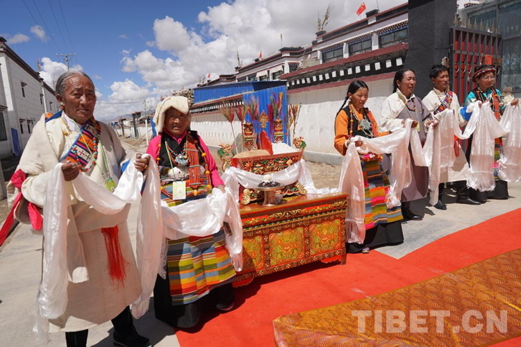 位于薩迦縣扯休鄉(xiāng)東北部的嘎吉林村,是庫區(qū)搬遷新村,2020年3月,全村139戶769人從海拔4000多米的土坯房搬遷到了這里海拔3800米的新房。得知班禪要來的喜訊,嘎吉林村村民及信教群眾身著節(jié)日盛裝、手捧潔白哈達,一早就自發(fā)聚集在村廣場上迎候班禪。村民旦珍高興地對記者說道:“自從搬到這兒以后,政府給我們每人分了5.5畝田地,每戶人家都享受著國家搬遷優(yōu)惠政策,住上了福利幸福房。尤其是有了村里的集體合作社,再也不用像以前那樣單打獨斗各家做各自的事了。現(xiàn)如今,無論是生活還是經(jīng)濟收入都一年比一年好。”