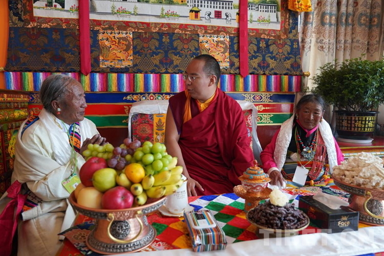 中午時分,班禪結(jié)束了對拉洛水利的調(diào)研,到扯休鄉(xiāng)嘎吉林村看望搬遷群眾,熱情的村民迎上前來向班禪獻上哈達和切瑪,班禪高興地揮手致意。班禪緩步來到村民歐珠老人家。班禪為家里的老人摸頂賜福,端坐在歐珠家人當中,詳細詢問搬遷后的生產(chǎn)生活情況。得知歐珠老人一家在搬遷后住房條件、生活條件等都有顯著改善,班禪感到十分欣慰。