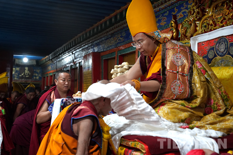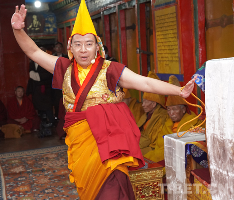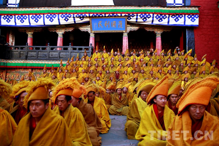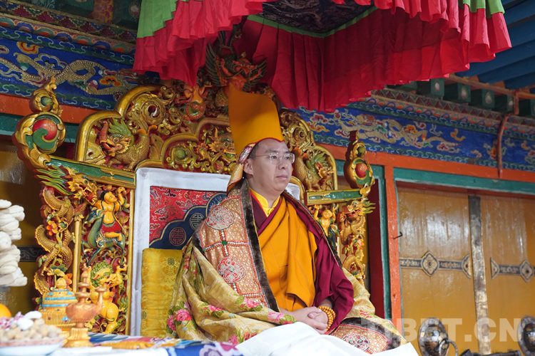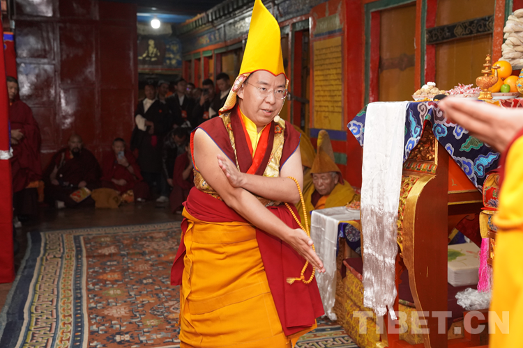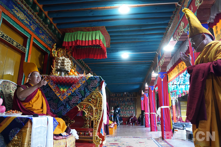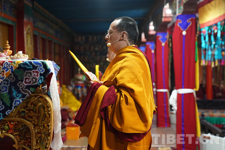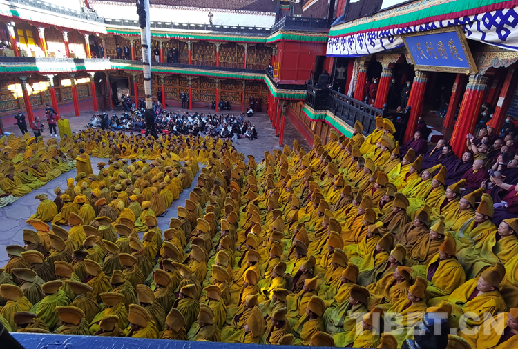 27日(藏歷9月22日),扎什倫布寺舉行祝賀班禪獲得嘎欽學位吉祥祈愿法會。班禪向在場所有僧眾摸頂賜福,并與僧眾集體誦經(jīng),回向祈福饒益眾生、法務昌隆、國泰民安、風調(diào)雨順。