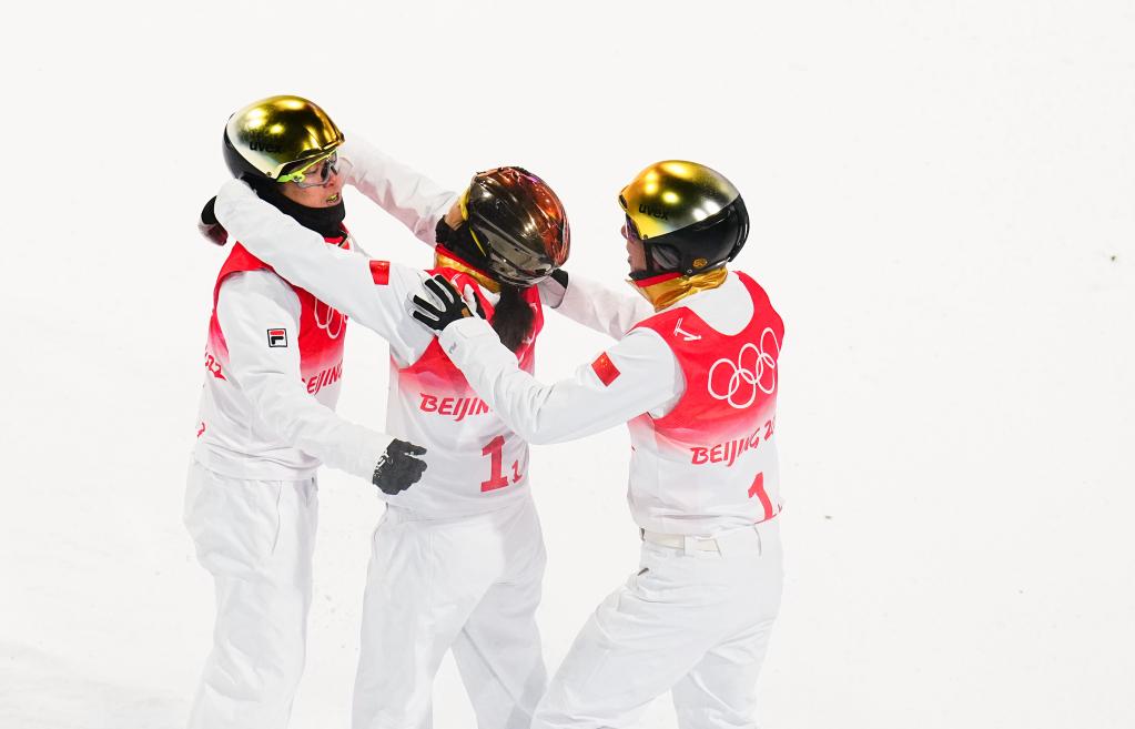 2月10日,中國(guó)隊(duì)選手徐夢(mèng)桃(中)與隊(duì)友齊廣璞(左)、賈宗洋在北京冬奧會(huì)自由式滑雪空中技巧混合團(tuán)體決賽后。新華社記者許暢攝
