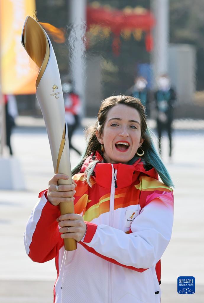 3月3日,火炬手國際殘奧委會運動員委員會委員瑪?shù)倌取P羅尼在傳遞火炬。新華社記者 杜瀟逸 攝