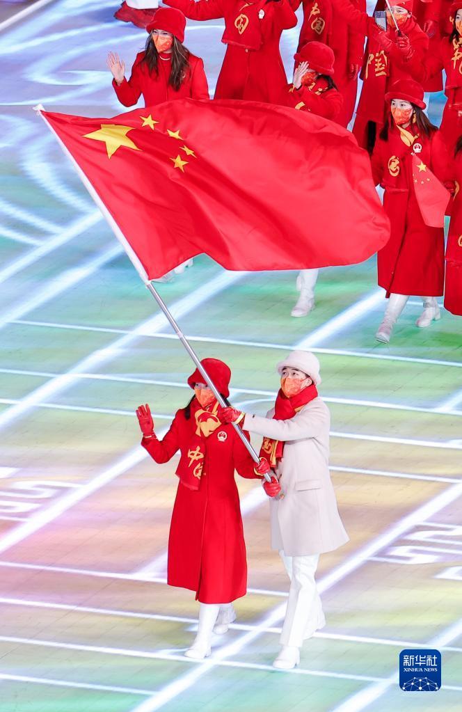 2月4日晚,第二十四屆冬季奧林匹克運(yùn)動會開幕式在北京國家體育場舉行。這是中國代表團(tuán)旗手趙丹(下左)、高亭宇(下右)在開幕式上入場。新華社記者 楊磊 攝