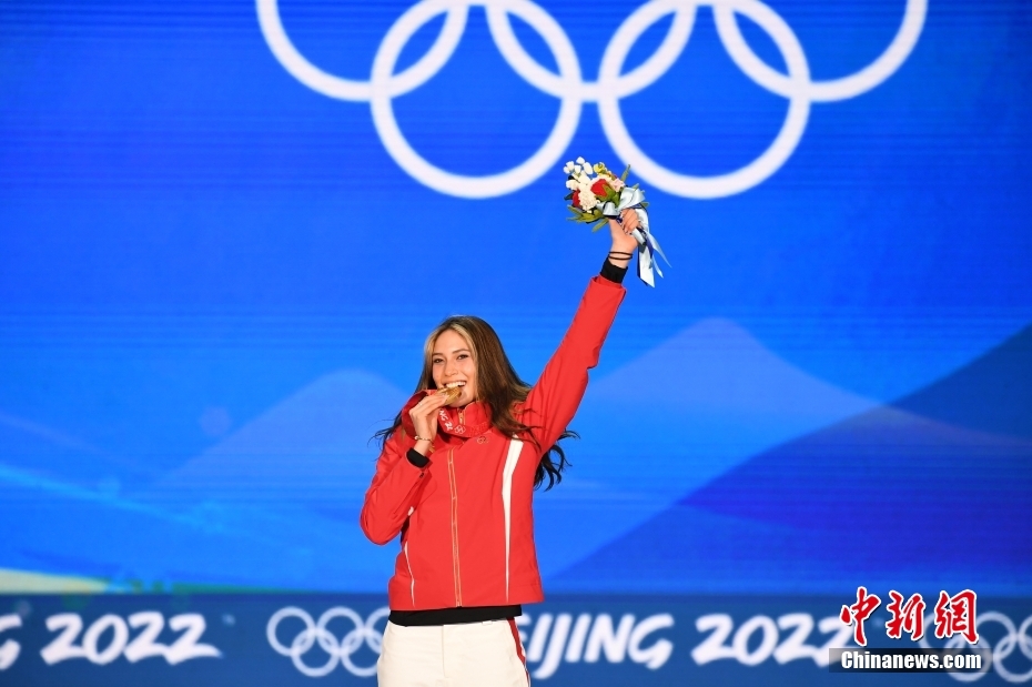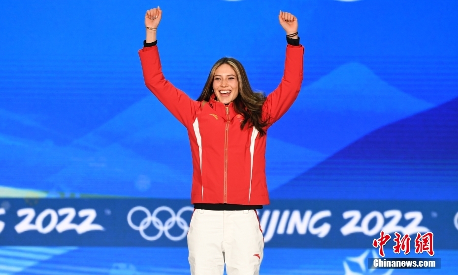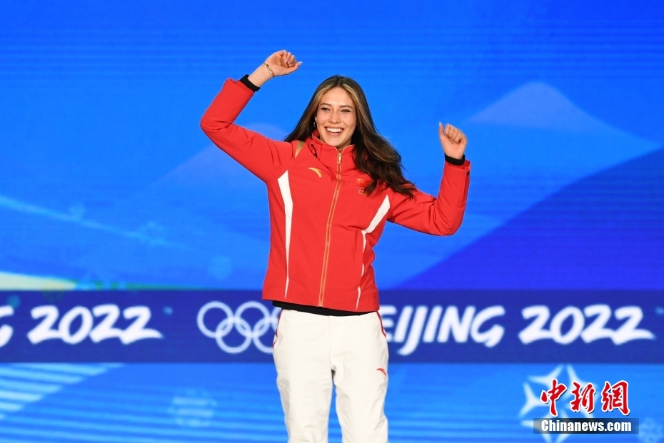 2月8日晚,北京冬奧會(huì)自由式滑雪女子大跳臺(tái)頒獎(jiǎng)儀式在北京頒獎(jiǎng)廣場(chǎng)舉行。圖為獲得冠軍的中國(guó)選手谷愛(ài)凌在頒獎(jiǎng)儀式上。 中新社記者 李駿 攝