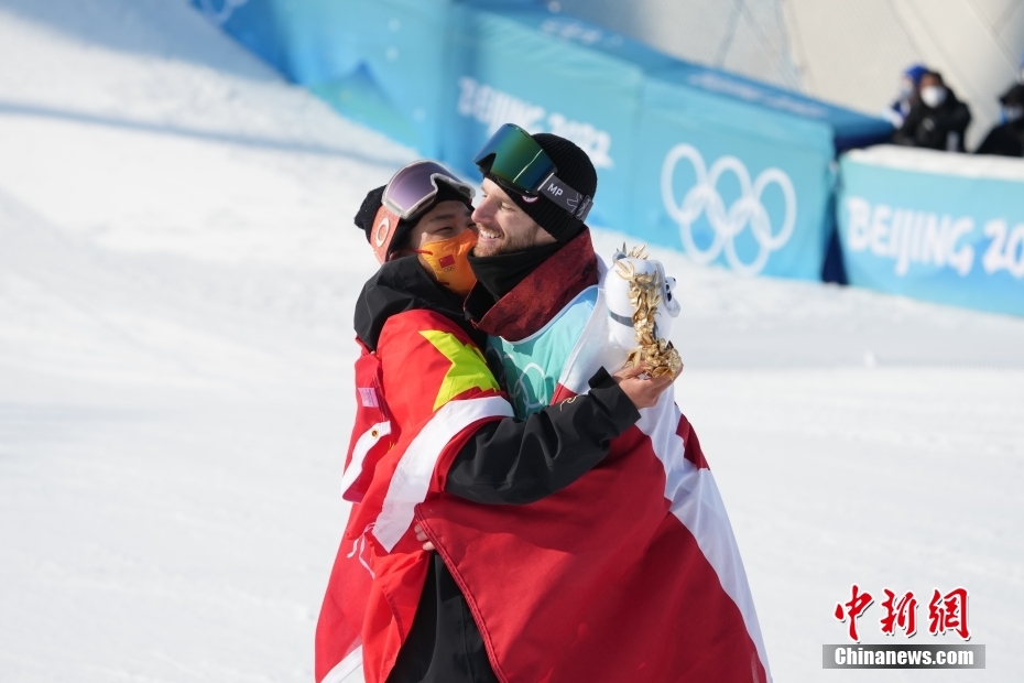 2月15日,北京2022年冬奧會單板滑雪男子大跳臺決賽在首鋼滑雪大跳臺舉行,中國選手蘇翊鳴獲得冠軍,挪威選手蒙斯·勒伊斯韋蘭獲得亞軍,加拿大選手馬克斯·帕羅特獲得季軍。圖為蘇翊鳴(左)與馬克斯·帕羅特?fù)肀А?中新社記者 毛建軍 攝