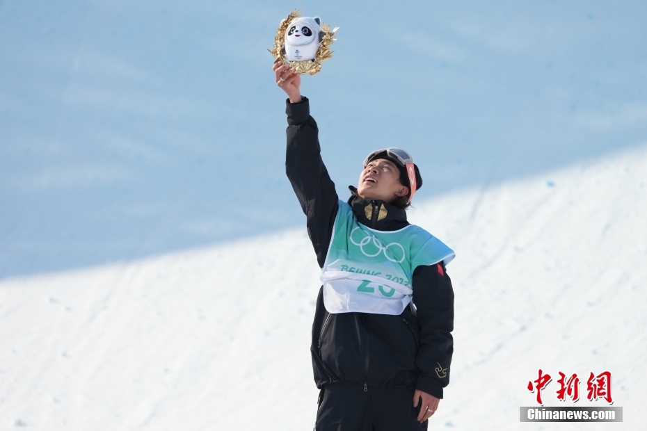 2月15日,北京2022年冬奧會單板滑雪男子大跳臺決賽在首鋼滑雪大跳臺舉行,中國選手蘇翊鳴獲得冠軍。圖為蘇翊鳴在頒發(fā)紀(jì)念品儀式上。 中新社記者 毛建軍 攝