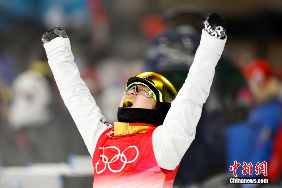 2月16日,中國(guó)選手齊廣璞在比賽后慶祝。當(dāng)日,北京2022年冬奧會(huì)自由式滑雪男子空中技巧決賽在張家口賽區(qū)舉行,中國(guó)選手齊廣璞奪得冠軍。 中新社記者 富田 攝