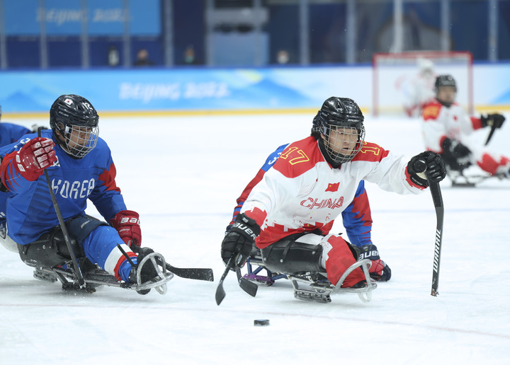 3月12日,中國隊球員申翼風(fēng)(右)在北京冬殘奧會冰球銅牌賽中進攻。新華社記者蘭紅光攝