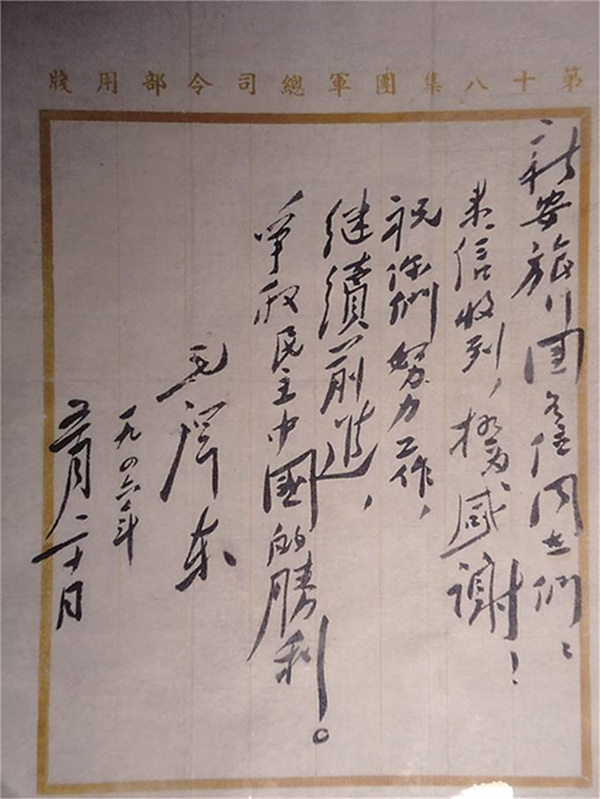 抗戰(zhàn)勝利后,新安旅行團給毛主席寫信,匯報工作和學(xué)習(xí)情況,表達在黨的領(lǐng)導(dǎo)下堅持革命斗爭的決心和信心。1946年5月20日,毛主席親筆給“新旅”復(fù)信:“新安旅行團全體同志:來信收到,極為感謝!祝你們努力工作,繼續(xù)前進,爭取民主中國的勝利?!比缃瘢@封珍貴回信的復(fù)制件就保存在新安旅行團歷史紀念館。