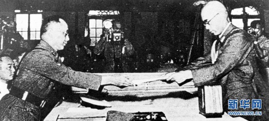 1945年9月9日,何應(yīng)欽(左)在南京代表中國政府接受侵華日軍總參謀長小林淺三郎遞交的侵華日軍總司令岡村寧次簽署的投降書。新華社發(fā)
