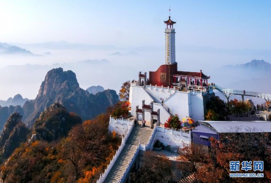 這是狼牙山棋盤陀峰頂?shù)摹袄茄郎轿逵率考o(jì)念塔”(2017年10月27日攝,無人機(jī)照片)。新華社發(fā)