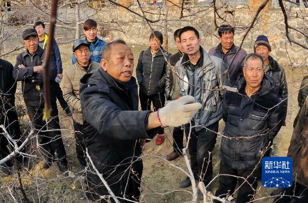 2016年1月27日,李保國(前左)在河北省內(nèi)丘縣崗底村向村民講解果樹修剪知識(shí)。新華社記者 朱旭東 攝