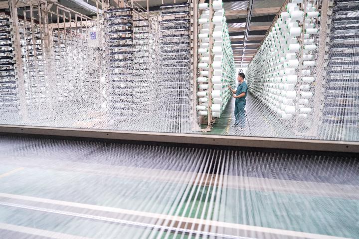 5月14日,工人在位于蘇州吳江區(qū)的一個(gè)紡織智能車間內(nèi)作業(yè)。(新華社記者李博攝)
