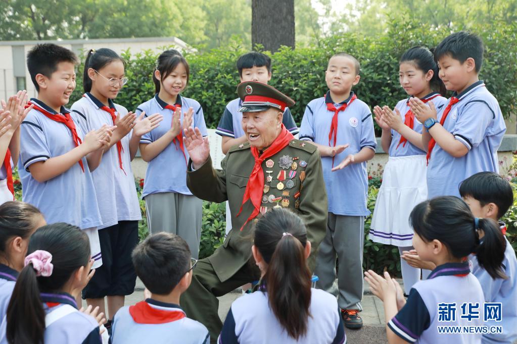 王占山(中)給河南省安陽(yáng)市三官?gòu)R小學(xué)的少先隊(duì)員們講戰(zhàn)斗故事(6月11日攝)。新華社發(fā)(戴丹華 攝)