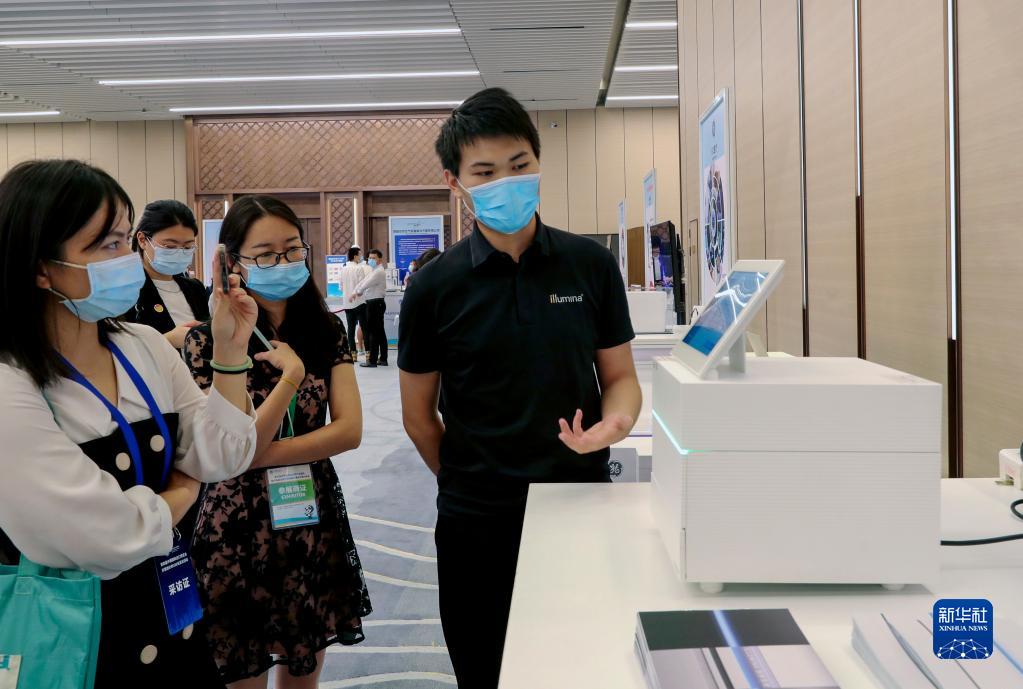 在國家會展中心(上海),第四屆進博會食品及農產品展區(qū)、醫(yī)療器械及醫(yī)藥保健展區(qū)展前供需對接會的工作人員在介紹一臺測序儀展品(7月26日攝)。新華社記者 方喆 攝