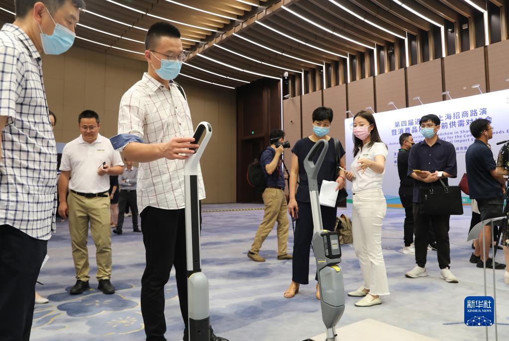 第四屆進博會上海招商路演暨消費品展區(qū)展前供需對接會在國家會展中心(上海)舉行,一家德國企業(yè)在對接會現場展出的清潔產品吸引參會嘉賓觀看(7月15日攝)。新華社記者 方喆 攝