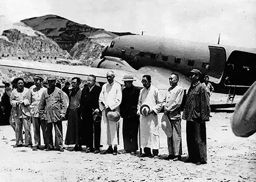 1945年7月,國民參政會參政員黃炎培等六人飛抵延安,同中國共產(chǎn)黨商談兩黨團結(jié)、共建國內(nèi)和平問題,毛澤東等親臨機場歡迎。 圖:新華社