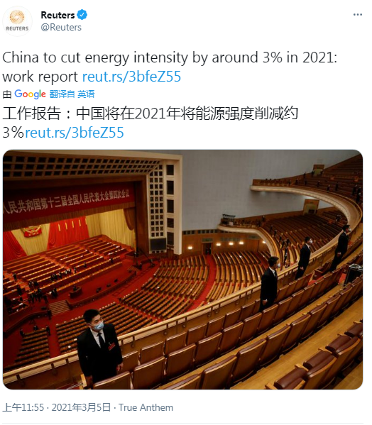 圖為兩會上的環(huán)保話題備受外媒矚目。路透社在推文中寫道,中國2021年發(fā)展主要預期目標:單位國內(nèi)生產(chǎn)總值能耗降低3%左右