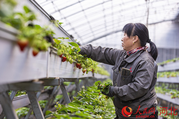 出香菇種植基地南行約3公里,就到了磁山二街的果蔬種植地。值守的工人趙師傅一按卷揚機按鈕,罩在外層的棚布徐徐卷起。推開日光溫室大棚的門,沿著用水泥鋪墊的路走進草莓采摘棚里,一陣夾雜著草莓香氣的暖風(fēng)迎面撲來。大棚內(nèi)一排排種植草莓的架子呈“A”字形,一壟壟草莓呈梯次立體排列。滴滴水珠通過智能滴灌系統(tǒng)潤澤著秧苗,顆顆紅寶般的草莓令人饞涎欲滴,綠葉間點綴著朵朵小白花,蜜蜂嗡嗡嚶嚶穿梭其間。