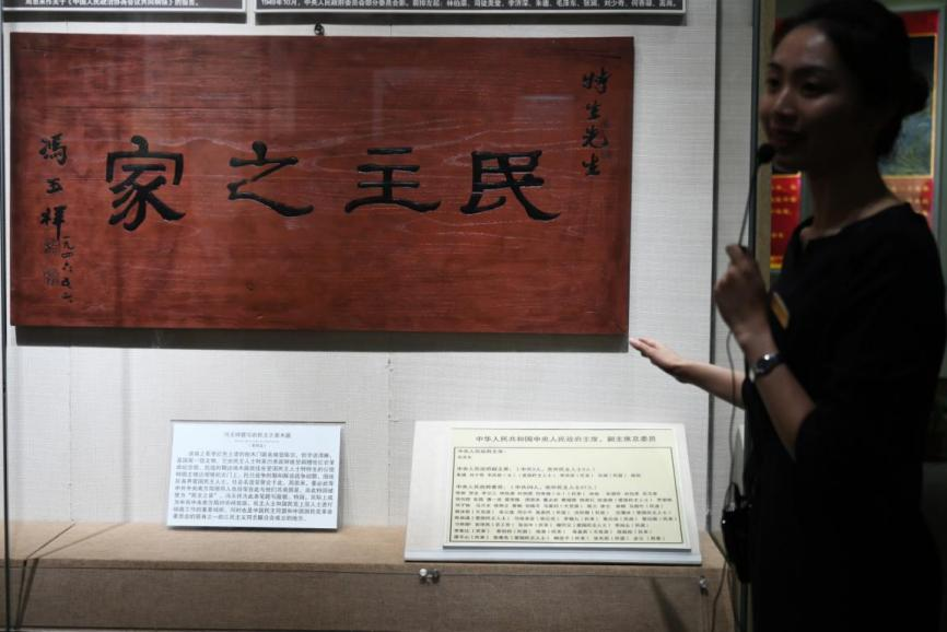 6月21日,在位于重慶的中國(guó)民主黨派歷史陳列館內(nèi),工作人員向媒體記者介紹展陳的“民主之家牌匾”。