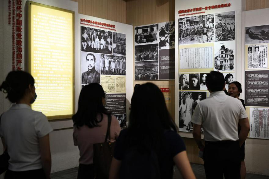 6月21日,在位于重慶的中國(guó)民主黨派歷史陳列館內(nèi),工作人員向媒體記者講述近代中國(guó)政黨政治的產(chǎn)生過程。