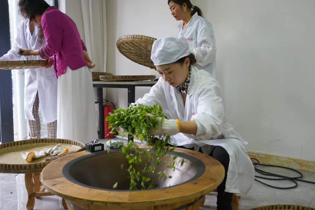 在相隔不遠的華夏茶藝培訓(xùn)學(xué)校里,幾名茶藝師現(xiàn)場展示高品質(zhì)茶葉制作的工藝流程。“茶葉殺青一般是5到7分鐘,殺透了以后就會把茶葉原有的活性酶等固定在里面?!辈杷噹熈沃炀髦鴮S檬痔?,坐在溫度超過200攝氏度的炒茶鍋邊給茶葉殺青。此前,臺盟成都市支部建立了“兩岸同耕”鄉(xiāng)建文創(chuàng)工作室,邀請臺灣的制茶師在夾關(guān)鎮(zhèn)開展制茶工藝研習(xí)活動。