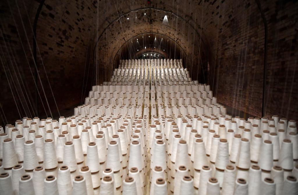 在陜西省寶雞市金臺(tái)區(qū)的長(zhǎng)樂(lè)塬抗戰(zhàn)工業(yè)遺址,其窯洞工廠(chǎng)最核心處有個(gè)“萬(wàn)枚紗錠進(jìn)窯洞”的造型:上百枚紗錠為一組,線(xiàn)頭聚攏伸向窯洞頂端。