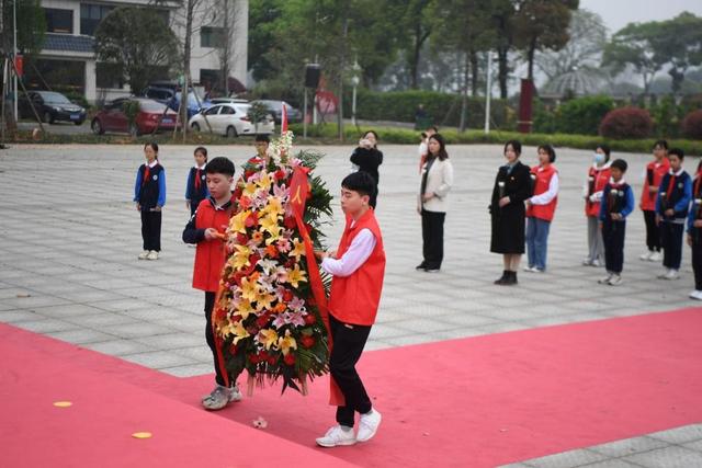 3月30日,長沙市長郡天心實驗學校學生在湖南革命陵園烈士紀念碑前敬獻鮮花。