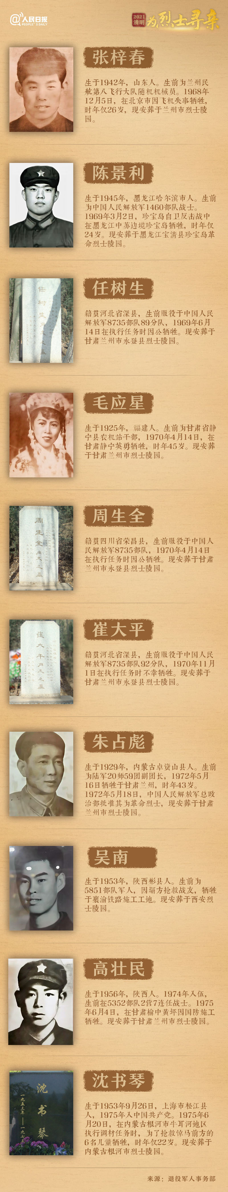 同時(shí),退役軍人事務(wù)部聯(lián)合人民日?qǐng)?bào)客戶端等媒體,公布100位烈士的尋親線索。這100位烈士的犧牲時(shí)間跨越1928年到1984年。烈士們生前有的是軍人,有的是地下黨員,有的是工人,有的是教師學(xué)生。不少烈士的出生年份等關(guān)鍵信息缺失,一些烈士未留下照片。