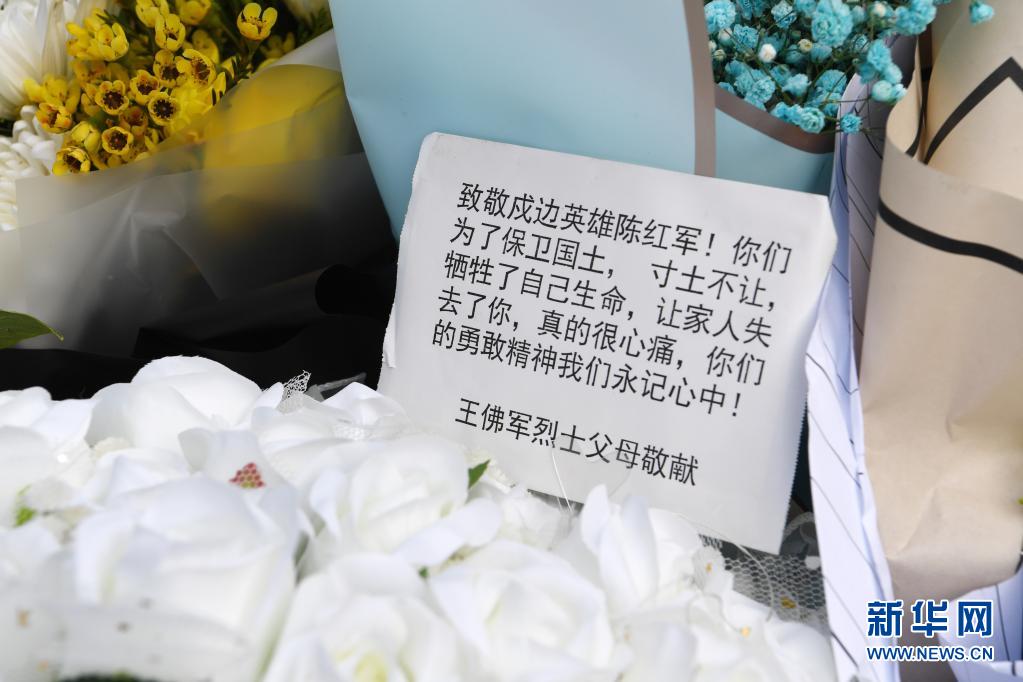 這是在甘肅省蘭州市烈士陵園拍攝的王佛軍烈士父母給陳紅軍烈士敬獻(xiàn)的花束留言(2月23日攝)。新華社記者 范培珅 攝